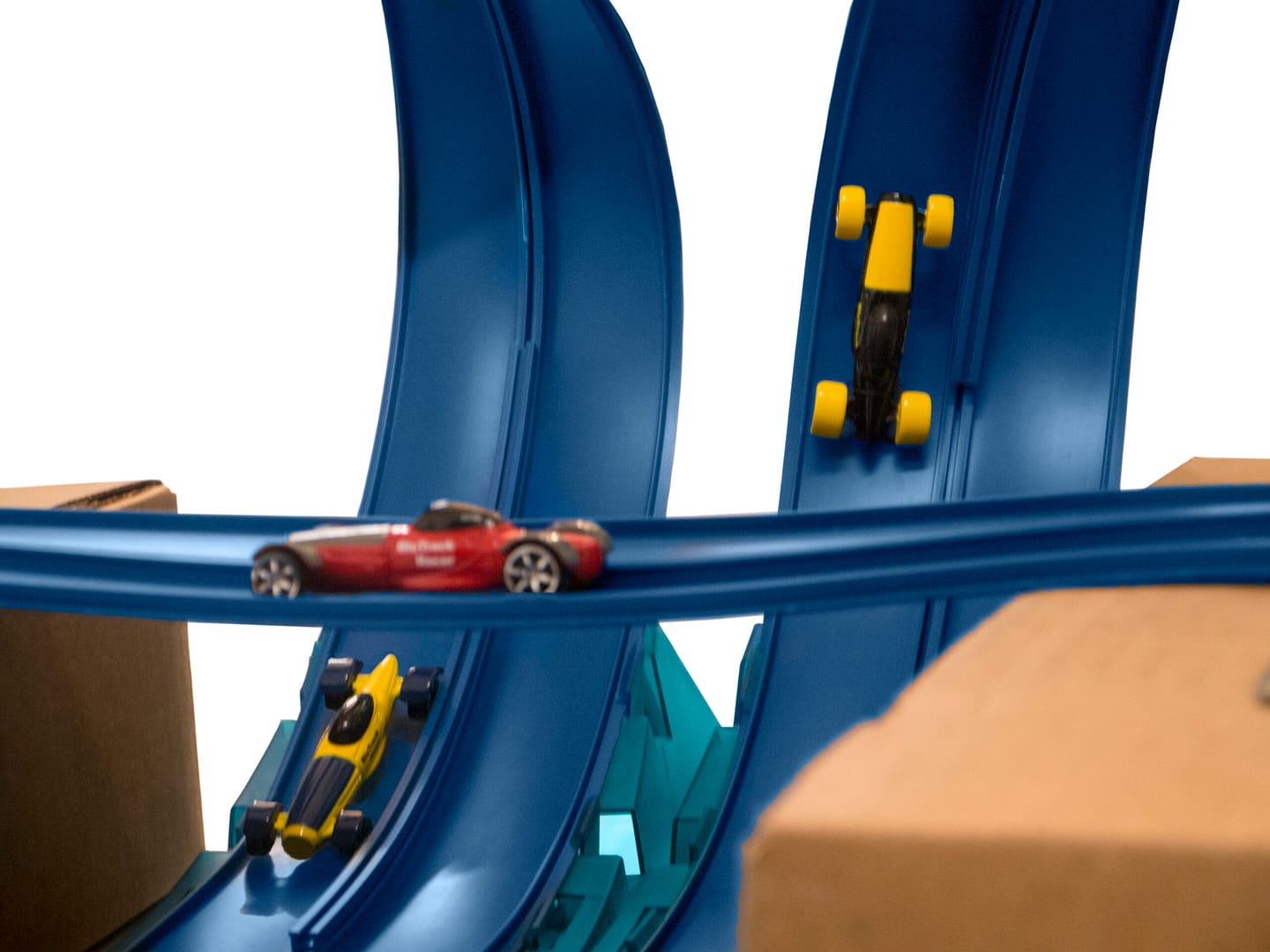 - Two-Lanes: Blu Track is designed with a middle rail so kids can race two cars or toys side-by-side orย watch them go down one at a time.